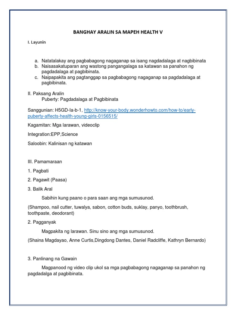 Banghay Aralin Sa Mapeh Health V Lp Emelyn