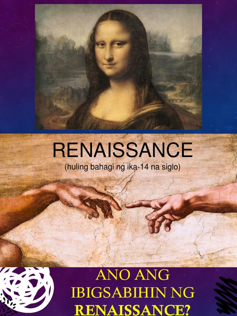 Michaelangelo Binarotti Leonardo Da Vinci 2. Ang higante ng siyentipikong Renaissance. Ang Renaissance ay nagsimula noong 1350 sa mga hilagang lungsod-estado ng Italya narating nito ang rurok ng katanyagan noong 1500.