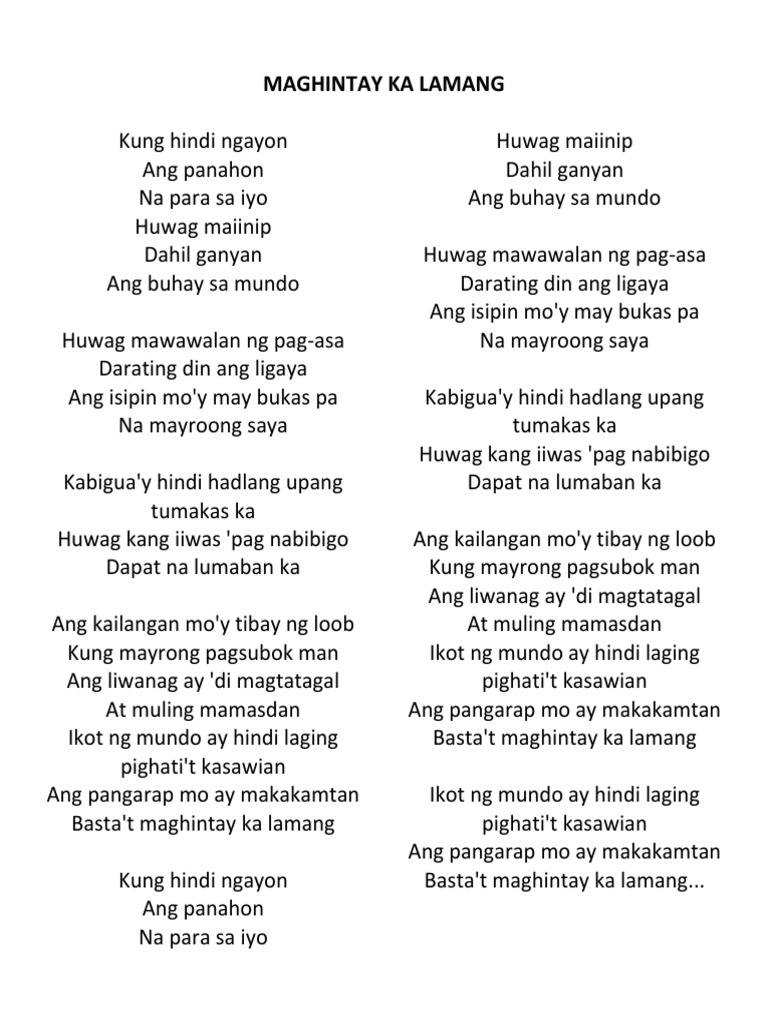 Kung hindi ngayon Ang panahon Na para sa iyo Huwag maiinip Dahil ganyan Ang buhay sa mundo Huwag mawawalan ng pag-asa Darating din ang ligaya Ang isipin moy may bukas pa Na mayroong saya. Ayaw na Ayaw mo sa Barkada ko di mo napapansin ang ugali mo Lagi ka nalang tama At Akoy Mali At Ako Pa Sayo Ay Walang Silbi. Sa ding ding Ian dsa.