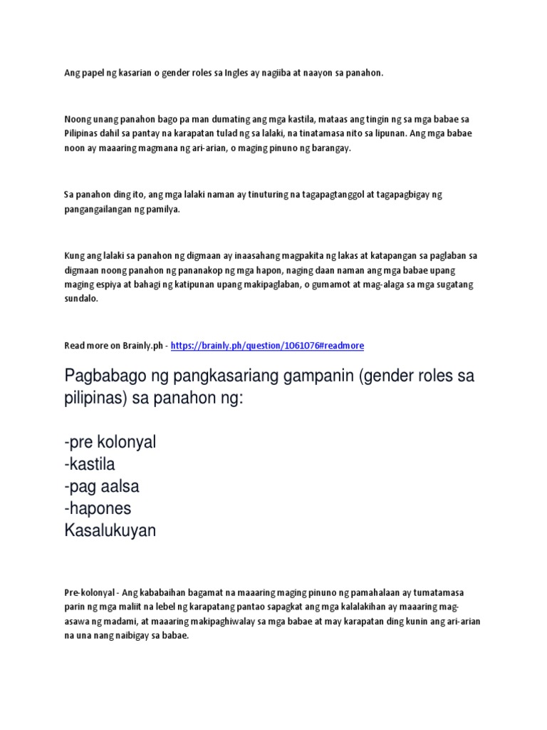 Scribd - Free 30 day trial. Isaayos ang sumusunod na mahahalagang pangyayari na nagpapakita ng gender roles sa Pilipinas. Dahil ito ay panahon ng paghahalo ng dalawang kultura makikita na unti-unti ang pagpantay ng katayuan ng mga babae sa katayuan ng mga lalaki.